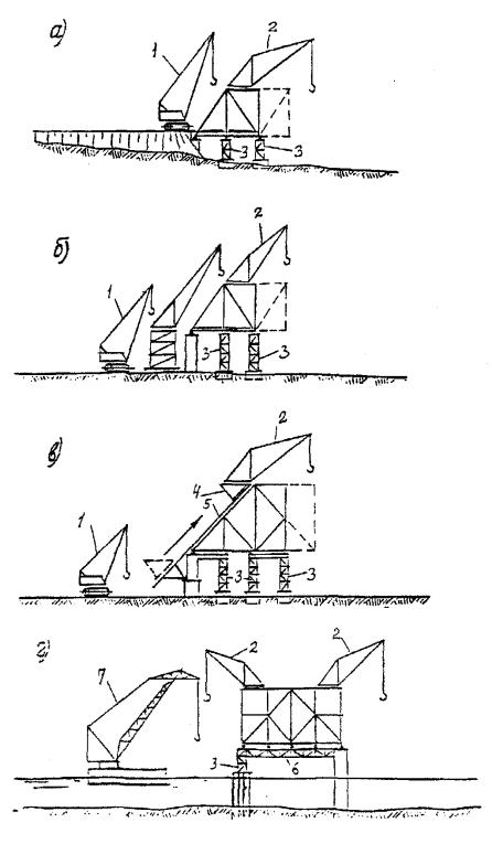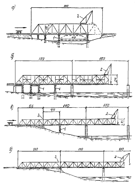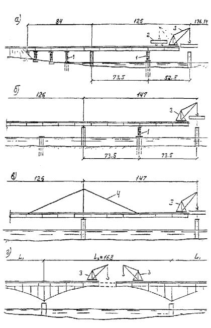 а - полунавесной монтаж одного пролетного строения через судоходные реки и каналы;