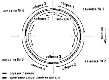 з) набор краном по аналогии с пунктом в) всех панелей на захватке № 4против хода часовой стрелки, начиная с последней панели, примыкающей к первойпанели на захватке № 1, за исключением второй панели захватки № 4, примыкающейк закрепленному отрезку панели, установленному согласно пункта ж) на местепервой панели захватки № 4;