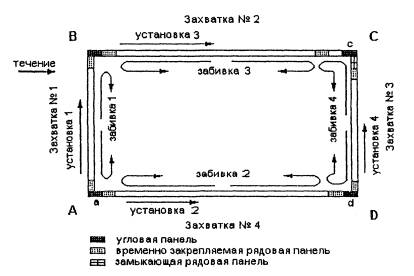 Возведениепрямоугольного ограждения рекомендуется начинать с верховой стороны реки ивыполнять в изложенной далее последовательности (рисунок Д.1):