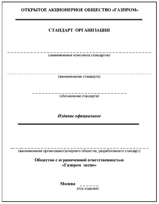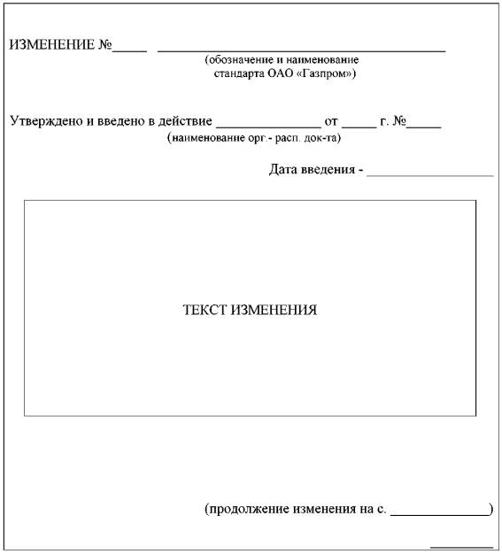 | РАСПОРЯЖЕНИЕ «___»_________20__г. Москва №_____________ Об утверждении и введении в действие стандарта организации _______________________________ 1. Утвердить и ввести в действие с «___»___________20__г. прилагаемый стандарт организации (указать наименование стандарта) (далее - Стандарт). 2. Признать утратившим силу с «___» ____________ 20__ г. в ОАО «Газпром»___________________________________________________________________. обозначение и наименование отменяемого документа в случае, если он был утвержден личной подписью руководящего лица, либо реквизиты нормативного акта об утверждении документа (пункт указывается при необходимости отмены документа) 3. ООО «Газпром экспо» (указать инициалы, фамилию руководителя) зарегистрировать Стандарт в установленном порядке, обеспечить его издание в количестве (указать тираж) и рассылку до (указать дату рассылки) структурным подразделениям, дочерним обществам и организациям ОАО «Газпром». 4. Утвердить прилагаемый план мероприятий по внедрению__________________________ _____________________________________________________________________________ (обозначение и наименование стандарта) 5. Руководителям организаций (дочерних обществ) ОАО «Газпром» обеспечить разработку и реализацию мероприятий по внедрению________________________________ ___________________________________ с учётом конкретных условий. (обозначение и наименование стандарта) 6. Контроль за исполнением настоящего распоряжения возложить на__________________ _____________________________________________________________________________ (должность, инициалы, фамилия руководителя департамента (управления, др. органа управления) (пункты 4, 5, 6 указывается при наличии плана мероприятий по внедрению стандарта) Заместитель Председателя Правления ____________ _____________ подпись инициалы, фамилия (по направлению деятельности)