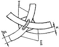 I -внутренняя поверхность корпуса аппарата (б) и трубопровода (в); II - наружная поверхностькорпуса аппарата (б) и трубопровода (в); 1, 2, 3, 4 - последовательностьвыполнения швов