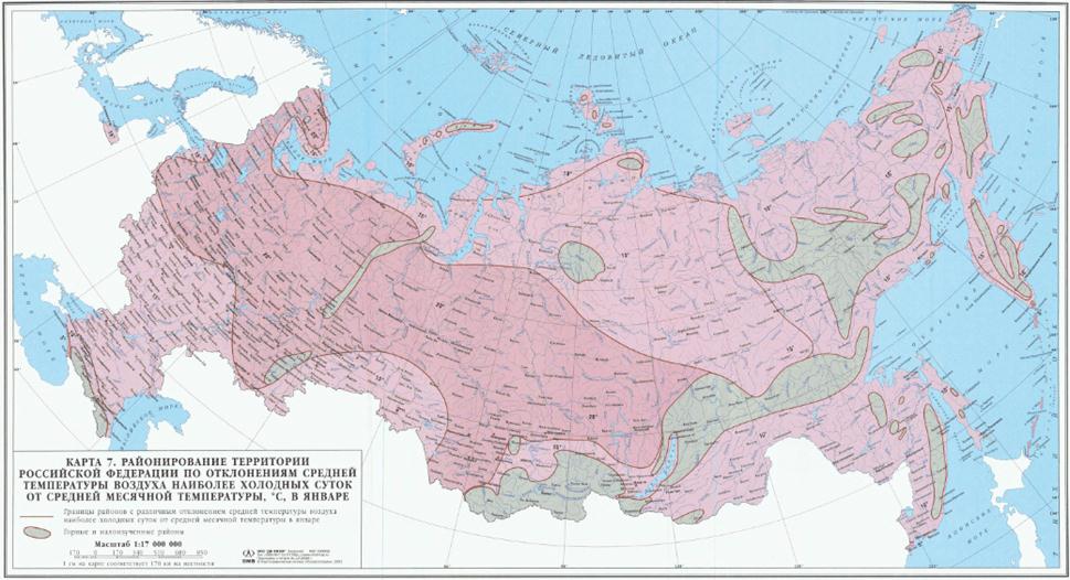 Районирование территории Российской Федерации по отклонениям средней температуры воздуха наиболее холодных суток от средней месячной температуры, °С, в январе