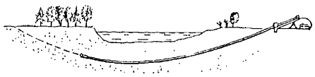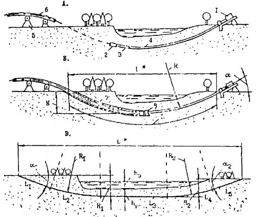 3.16. В зависимости от соотношения ширины водной преграды с крутизной ее берегов и глубиной следует принимать профиль БППТ как часть окружности радиуса, равного или большего, чем радиус допускаемого упругого изгиба прокладываемого трубопровода, или как сочетание сопрягаемых дуг таких окружностей с прямолинейными отрезками. При этом согласно СНиП III-42-80 допустимые радиусы упругого изгиба составляют: