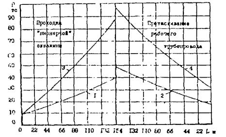 Рис. 8. Усилия проходки «пионерной» скважины и протаскивания рабочего трубопровода в песчаном грунте: