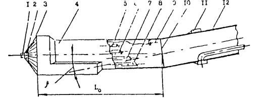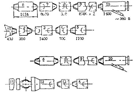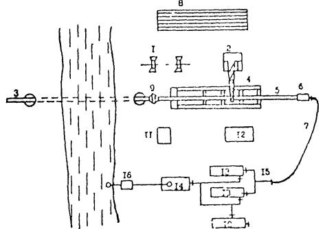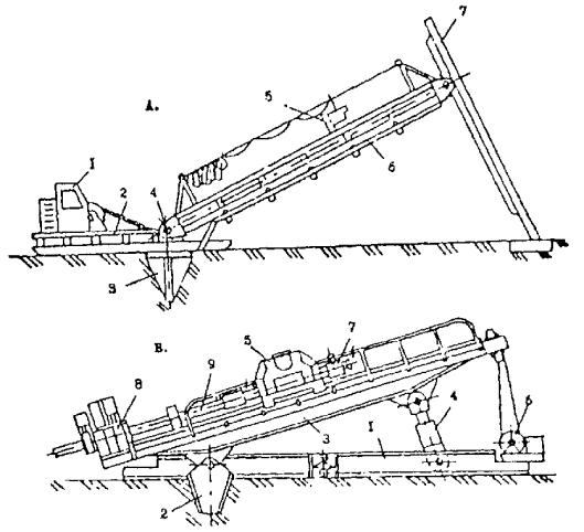 1 - Проходческая установка. 2 - Долото. 3 - Привод долота (электробур). 4 - Буровая колонна. 5 - Опоры. 6 - Плеть рабочего трубопровода. 7 - Глинистый раствор. 8 - Расширитель