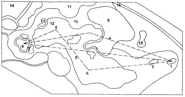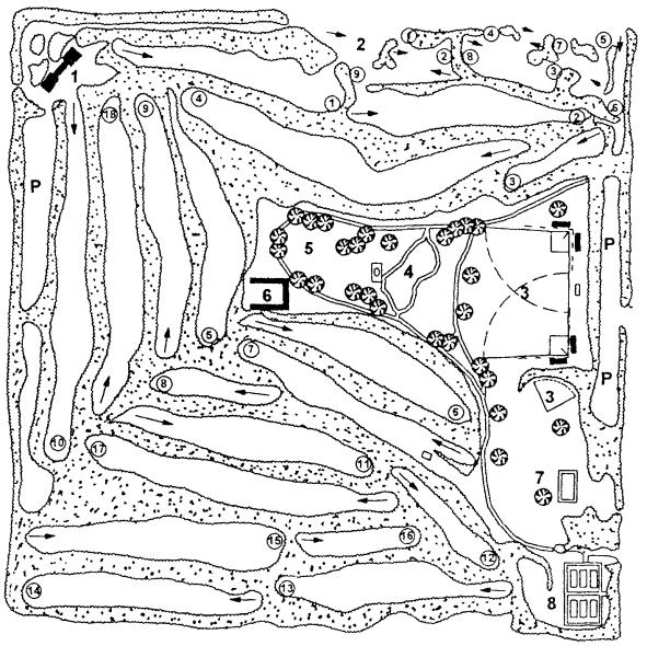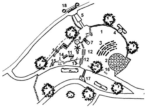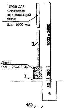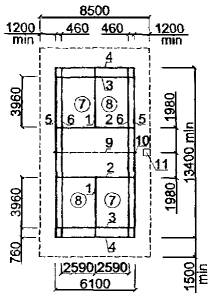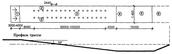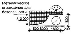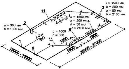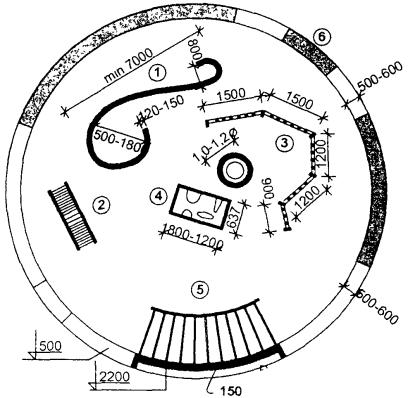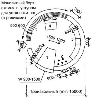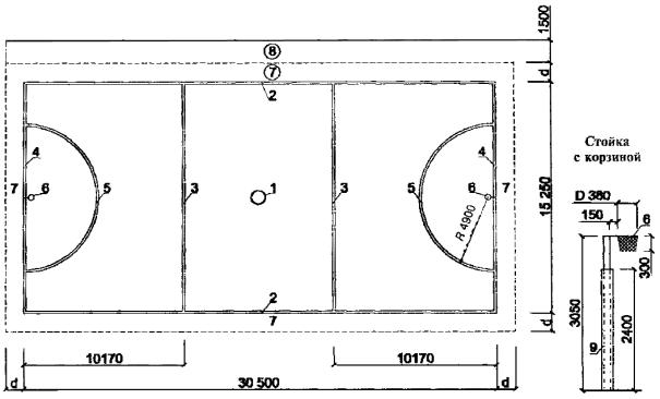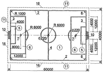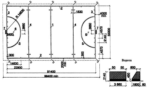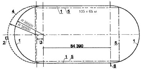 1 - открытый водоотводный лоток; 2 - бордюрные камни с зазорами для стока воды; 3 - ограждение; 4 - дренажные трубы D = 80 - 120 мм длиной 2 - 3 м с отверстиями D = 1 мм через 12 - 15 мм; 5 - дрены - дренажные трубы D = 80 - 120 мм в закрытых дренажных канавах, расстояние между дренами 0,9 - 1,2 м на суглинистых грунтах и 0,4 - 0,6 м на глинистых грунтах; 6 - «рабочая» зона - поле для игры с зонами безопасности
