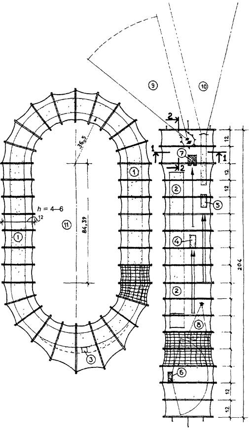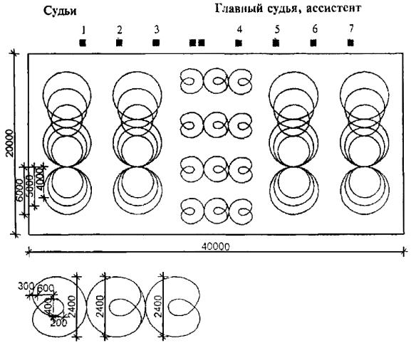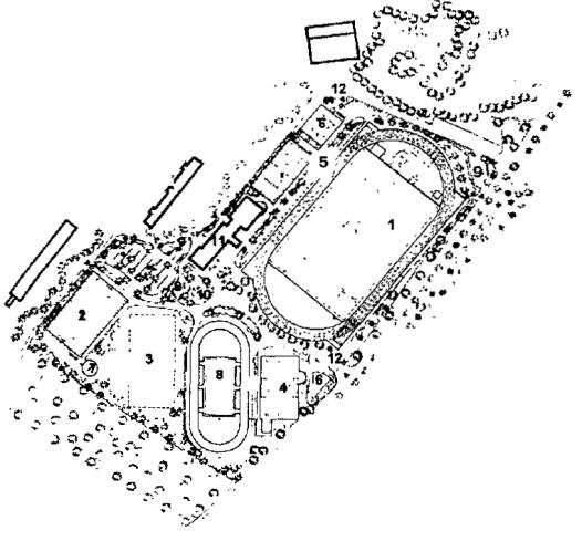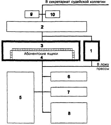 1 - фотофиниш; 2 - пульт управления табло; 3 - судьи по информации; 4 - аппаратура для музыкального сопровождения; 5 - главная судейская коллегия; 6 - фотолаборатория