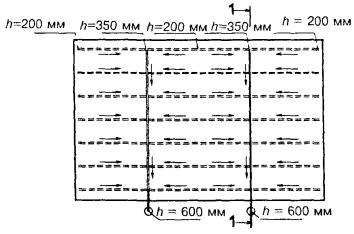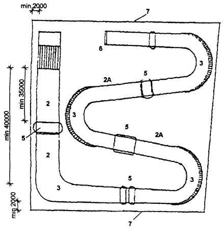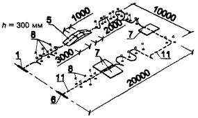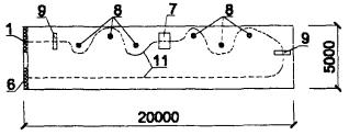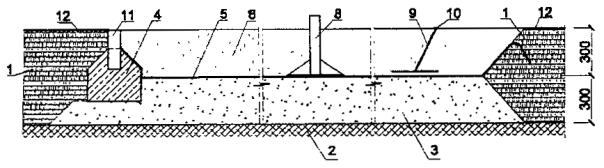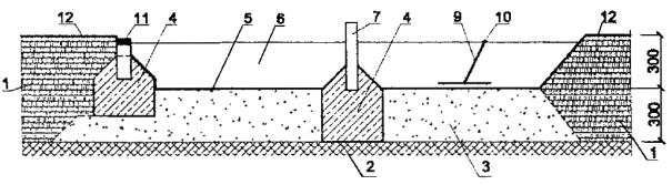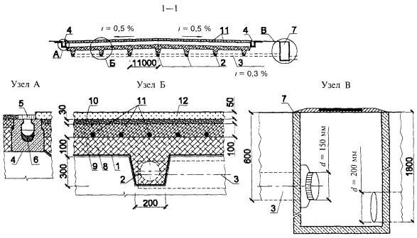 1 - геотекстиль; 2 - продольная дренажная труба d = 100 мм; 3 - поперечная дренажная труба d = 150 мм; 4 - железобетонный лоток; 5 - деревянная решетка; 6 - бетонная стяжка; 7 - промежуточный колодец; 8 - щебень фракций 5 - 40 мм; 9 - щебень фракций 2 - 10 мм; 10 - щебень фракций 1 - 5 мм; 11 - отопительные трубы d = 25 мм; 12 - синтетическая трава