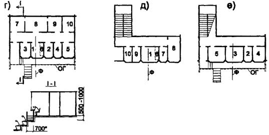 г - при ложе в одном уровне; д - при ложе в одном уровне, верхний уровень; е - то же, нижний уровень; 1 - фотофиниш; 2 - пульт управления табло; 3 - судьи по информации; 4 - аппаратура для музыкального сопровождения; 5 - главная судейская коллегия; 6 - видеомонтажная; 7 - главный секретарь; 8 - секретариат; 9 - машинописное бюро; 10 - множительная техника; ОГ - ограждение; Ф - финишный створ