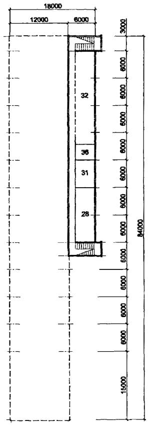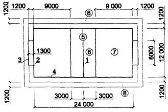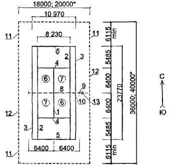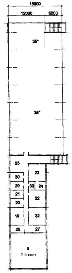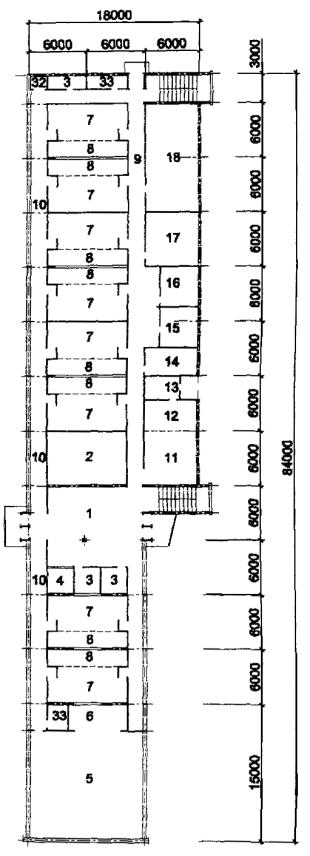 1 - вестибюль; 2 - гардероб; 3 - санузлы; 4 - хранение и ремонт прокатных ботинок с коньками; 5 - зал тренажерной подготовки и ОФП; 6 - инвентарная; 7 - командные раздевальные - тип I; 8 - сантехнические помещения при раздевальных; 9 - проход к раздевальным; 10 - проход к футбольным полям; 11 - торговый зал буфета (кафе); 12 - подсобные помещения буфета; 13 - тамбур - тарная буфета; 14 - помещения работников охраны; 15 - кабинет врача; 16 - кабинет функциональной диагностики; 17 - блок массажной; 18 - блок сауны; 19 - кабинет директора; 20 - приемная; 21 - кабинет заместителя директора; 22 - тренерская; 23 - методический кабинет - помещение для собраний; 24 - кладовая наглядных пособий; 25 - холл для отдыха; 26 - радиокабина (управление звукофикацией комплекса); 27 - балкон; 28 - бытовые помещения для рабочих; 29 - бухгалтерия; 30 - помещение коменданта; 31 - хозяйственная кладовая; 32 - технические помещения; 33 - помещения для уборочного инвентаря; 34 - зона площадок для настольного тенниса*; 35 - солярий*; 36 - помещение завхоза