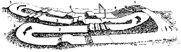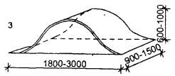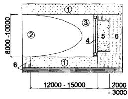 1 - водоотводные канавки; 2 - насыпь для создания уклонов; 3 - рыхление и подготовка почвы на глубину 150 - 200 мм; 4 - очистка верхнего слоя 30 мм с выравниванием по уклону и уплотнение грунта
