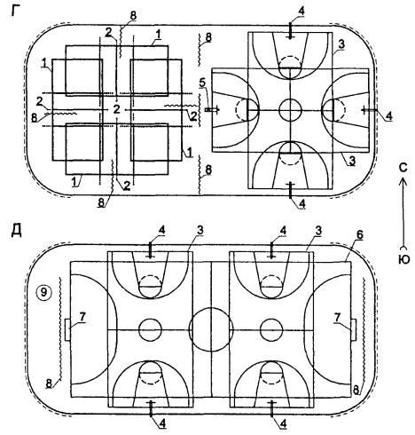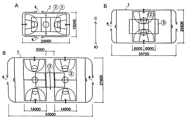 При наличии в составе спортивных сооружений нескольких площадок для спортивных игр одного вида не более одной трети этих площадок допускается ориентировать продольными осями в направлении восток-запад.