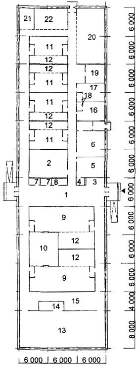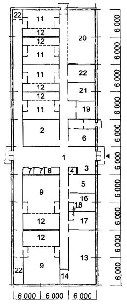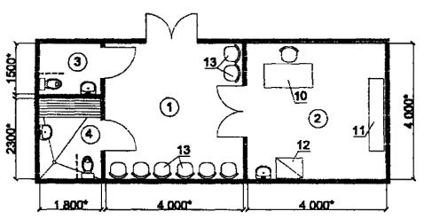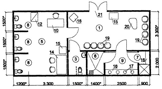 10 - стол врача (медсестры); 11 - смотровая кушетка; 12 - шкаф; 13 - стулья для ожидающих приема; 14 - стол для анализа проб; 15 - холодильник; 16 - скамья; 17 - сушилки для волос; 18 - телевизор; 19 - мягкий стул; 20 - стол для напитков; 21 - охраняемый вход