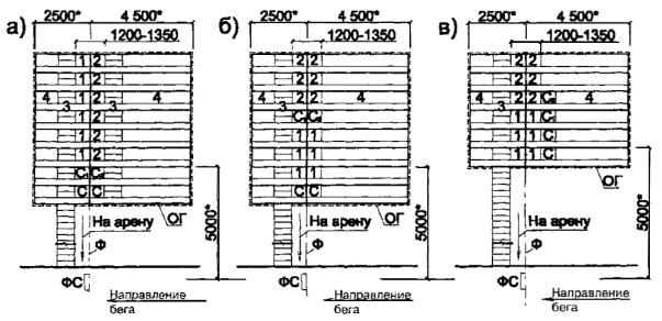 а - с двумя служебными лестницами при размещении судей каждой бригады по одному; б - с одной служебной лестницей при размещении судей каждой бригады попарно; в - с минимальным числом рядов, отводимых под судейскую ложу; 1 - место судьи на финише; 2 - место судьи-хронометриста; 3 - служебная лестница; 4 - места свободных судей; С1 - место старшего судьи на финише; С2 - место старшего судьи-хронометриста; С - место секретаря по бегу (со съемным пюпитром для ведения протокола); Ф - финишный створ; ФС - финишная стойка; ОГ - ограждение
