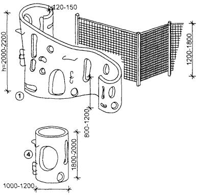 1 - естественный грунт; 2 - подстилающий грунт, при необходимости дренированный; 3 - гравий или щебень; 4 - бетонный фундамент; 5 - разделительное полотнище; 6 - песок; 7 - гильза для стойки сетки; 8 - гильза для стойки ворот с анкерной плитой; 9 - эластичный держатель на анкере; 10 - маркировочная лента; 11 - ограничитель зоны безопасности; 12 - покрытие