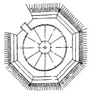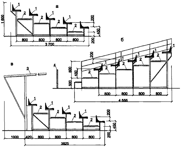 а - невысокие экономичные трибуны для случаев отсутствия препятствий обзору; б - приподнятые трибуны для случаев, когда обзору мешают препятствия (борт хоккейной коробки, теннисный корт, рекламные щиты и др.); в - невысокие экономичные трибуны с легким навесом
