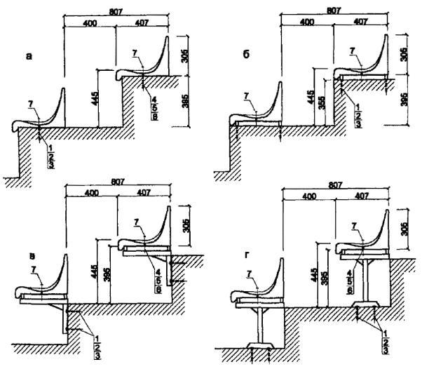 а - крепление стадионных сидений непосредственно на бетонную поверхность «гребенки»; б - то же, к металлоконструкциям, установленным на бетонную поверхность «гребенки»; в - то же, к консольным металлоконструкциям; г - то же, на поддерживающие металлоконструкции