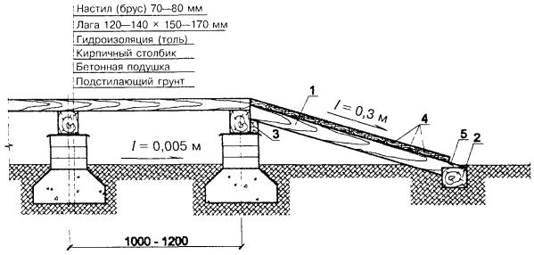 1 - брусок обрешетки 100×150 мм; 2 - опорный брус 120 - 140×150 - 170 мм; 3 - опорная чурка; 4 - доски толщиной 40 мм деревянного откоса; 5 - щель 30 - 50 мм для вентиляции и сброса воды