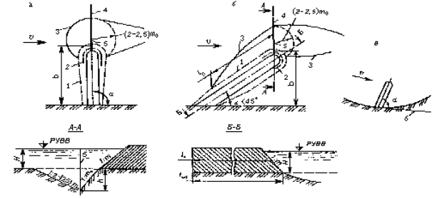 - сплошныхнезатопляемых поперечных регуляционных сооружений, отжимающих поток от пойменныхнасыпей (траверсы) или от берегов и насыпей на прижимных участках рек (буны,шпоры и т.п.), а также затопляемых сооружений (типа полузапруд).