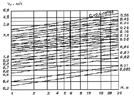 3. По графику(см. рисунок А.1)размывающая скорость для частиц грунта 0,5 мм и глубине потока Н = Нр= 6,5 м υ0 = 0,87 м/с.