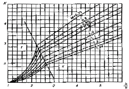 2. Для условийпрохода расчетного паводка (Н = 6,5м, υ = 1,0 м/с) требуется уточнение скорости потока в голове шпоры υги весового коэффициента f1,учитывающего снижение глубины местного размыва за счет затопления сооружения.