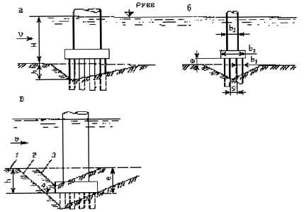 а и б - профиль и фасад опоры с плитойростверка выше дна русла после общего размыва; в - профиль опоры с плитой ростверка ниже дна русла:
