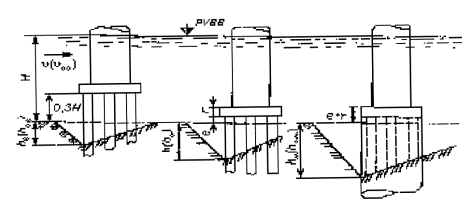 5.1.4. Наибольшую глубину местного размыва в однородном несвязномгрунте у опор на свайном основании следует определять в зависимости отположения низа плиты ростверка еотносительно дна русла после общего размыва (рисунок 5.4):