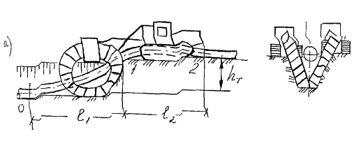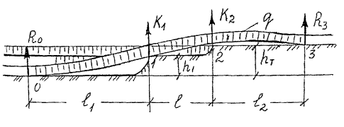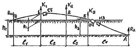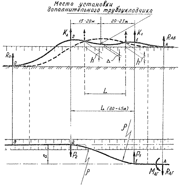 Расчетно-технологическая схема к обоснованию выбора числа трубоукладчиков при укладке трубопроводов газлифтных систем (сплошными линиями обозначены контуры трубопровода с толщиной стенки 20 мм, штриховыми - с толщиной стенки 8 -10 мм)