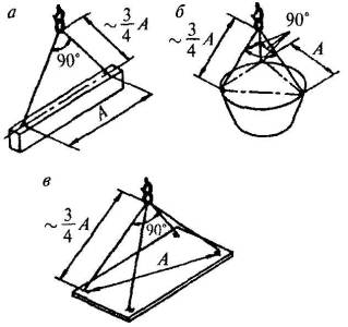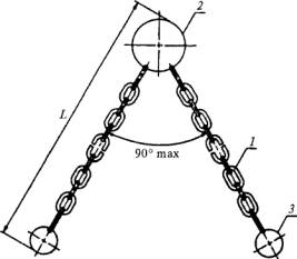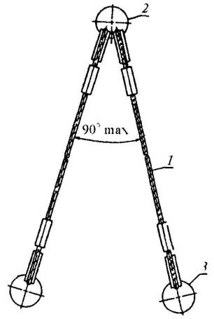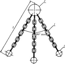 2.1.3. Определение усилий в канатах и цепях двух-, трех- и четырехветвевых стропов при отсутствии дополнительных требований производят исходя из условия, что углы между ветвями не превышают 90° (рис. 1).