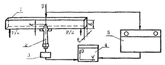 1 - образец для испытания на сосредоточенный изгиб; 2 - датчик перемещения; 3 - усилитель измерительного сигнала; 4 - двухкоординатный самописец; 5 - испытательная машина с электроизмерителем