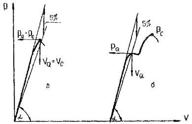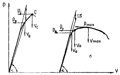 Усилия РQ и РС необходимы для вычисления величин КIC и КС. Сила РQ равна разрушающей нагрузке РС, если диаграмма "Р-V" оканчивается внутри угла, тангенс которого нa 5% меньше, чем тангенс угла касательной к начальной части диаграммы (черт. 5а). Для диаграммы черт. 5б, имеющая скачек внутри этого угла, сила PQ соответствует максимуму нагружения при скачке. По диаграммам черт. 6а и 6б силу РQ определяют в месте пересечения диаграмм с указанной 5%-й секущей. Если при испытаниях удается зафиксировать нагрузку Р0, соответствующую началу докритического подрастания трещины, то для диаграммы черт. 6б допускается принимать РQ= Р0.