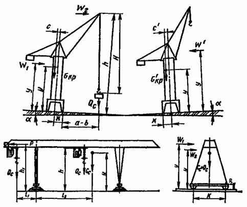 3.6.1. Устойчивость грузоподъемного крана с учетом действующих нормативных нагрузок с их возможным отклонением зависит от номинальных значений (предельное состояние), действия ветровой нагрузки наклона кранового пути, наличия поднятого груза, влияния сил инерции в случае резкой остановки крана. В результате получим уравнение моментов относительно ребра опрокидывания: