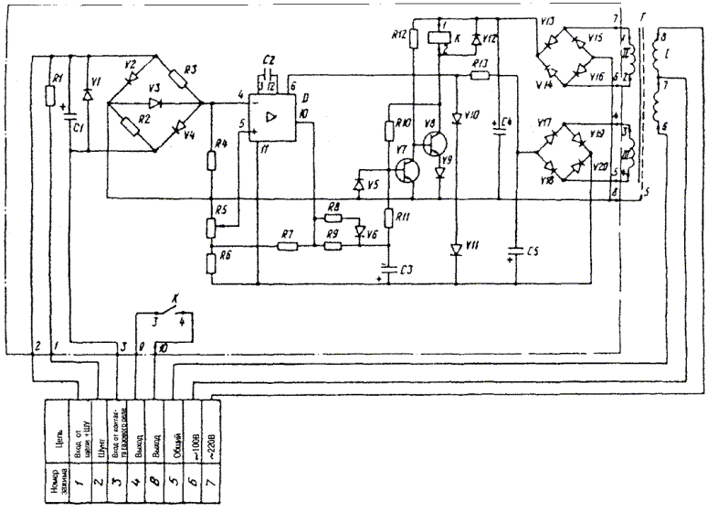 Питание устройства осуществляется от сети переменного тока напряжением 220 В через трансформатор Т, имеющий две вторичные обмотки. От обмотки II через выпрямитель на диодах V13 - V16 со сглаживающим конденсатором С4 питается цепь обмотки реле. От обмотки III через выпрямитель на диодах V17 - V20 со сглаживающим конденсатором С5 и стабилизатором на стабилитронах V10, V11 питается компаратор.