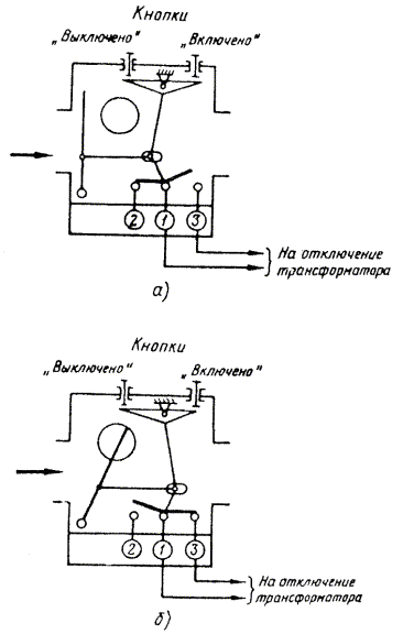 При медленном нажатии кнопки рейка, двигаясь в направляющей рамке, опускается примерно на половину своего хода и отводит пружинную защелку из прорези установочной скобы 1, что приводит под действием силы тяжести груза 6 к возврату пластины 9 в нормальное положение и к размыканию контакта реле (сквозь смотровое стекло видно, как груз возвращается в горизонтальное положение). При дальнейшем нажатии кнопки вниз до упора выступ 3 рейки 2 нажимает на закругленный край держателя груза 10 и последний поднимается, как при давлении струи масла на пластину реле (сквозь смотровое стекло видно, когда реле переходит в положение срабатывания), что вызывает действие реле на отключение.