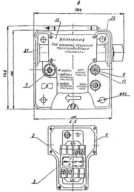 На крышке корпуса реле установлен кран 23 для отбора пробы газа и выпуска воздуха из реле; коробка выводов 26 служит для подключения контрольного кабеля. На крышке реле нанесена стрелка, указывающая направление к расширителю. В дне коробки зажимов предусмотрено отверстие для стока собирающейся в ней влаги. В нижней части корпуса реле предусмотрена пробка 25 для спуска загрязненного масла. Реагирующий блок реле крепится к крышке корпуса с помощью стоек, на которых смонтированы все элементы реле.