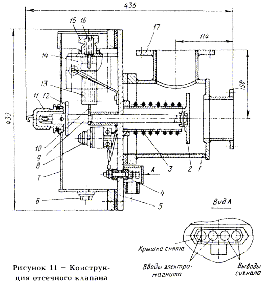 Изменение скорости срабатывания реле достигается выбором расстояния между пластиной 9 и магнитом 10 путем изменения положения магнита. Трем положениям магнита соответствуют уставки скорости срабатывания 0,65 м/с, 1,0 м/с и 1,5 м/с. Магнит передвигается после отвинчивания винта магнитодержателя и перемещения последнего до появления в окне магнитодержателя цифры требуемой уставки. Время срабатывания отключающего элемента реле при скорости потока масла, равной 1,25 значения уставки, составляет 0,15 с; при скорости потока масла, равной 1,5 значения уставки, - не более 0,1 с. Выводы сигнального и отключающего контактов реле размещены в коробке зажимов 12. На внутренней стороне откидной крышки 13 этой коробки имеется табличка с маркировкой выводов. Крышка коробки зажимов имеет надежное уплотнение. Кабель цепей защиты может быть подведен в любое из двух отверстий коробки, неиспользуемое отверстие остается закрытым заглушкой с винтовой резьбой.