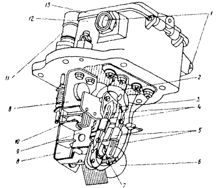 Отключающий элемент (как и сигнальный) крепится к сборочной скобе 8 и состоит также из пластмассового поплавка 6, круглого магнита 7 и отключающих контактов 5. Напорная пластина 9 отключающего элемента удерживается в нормальном положении с помощью постоянного магнита 10. Она предназначена для срабатывания от потока масла; при определенной скорости потока преодолевается сила притяжения магнита 10 и пластина отклоняется на некоторый угол, поворачиваясь вокруг своей оси. Для достижения требуемого быстродействия пластина помещена против входного отверстия реле и при своем движении не связана с поплавком 6 отключающего элемента; только в конце хода пластина нажимает на поплавок, который опускается, что приводит к замыканию отключающих контактов 5 реле.