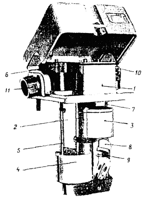 Газовые реле ВF 80/Q (ВF 50/10) производства Германии (рисунок 3) состоят из корпуса и крышки, к которой крепится реагирующий блок реле. Реле ВF 80/Q имеет квадратный фланец с проходным отверстием 80 мм, реле ВF 50/10 - круглый фланец с проходным отверстием 50 мм. На крышке закреплена табличка с указанием типа реле и его данных. На крышке и корпусе изображены стрелки, указывающие направление в сторону расширителя. Стальная сборочная скоба 8 крепится двумя винтами к крышке реле; к этой скобе крепятся сигнальный и отключающие элементы, постоянный магнит 10 и ряд других деталей реле.