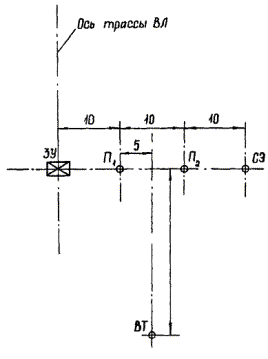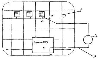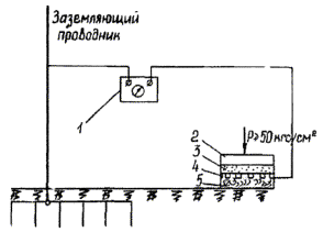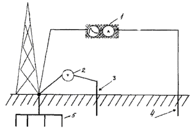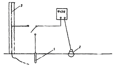 1 - пробный электрод длиной 0,5 м, диаметром 10 мм; 2 - электрод сравнения; 3 - заземлитель ЗУ