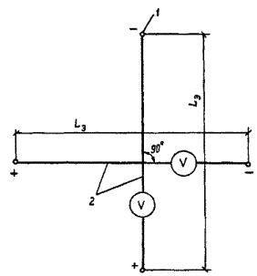 При отсутствии подземных металлических сооружений наличие блуждающих токов следует определять, измеряя разность потенциалов по двум взаимно перпендикулярным направлениям при разносе измерительных электродов на 100 м (рис. П3.3).