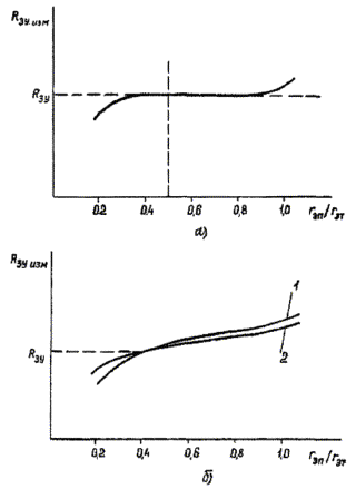 сопротивление заземлителя Rз оценивается с учетом Rзу доли тока (a), протекающего по отходящим коммуникациям, по выражению