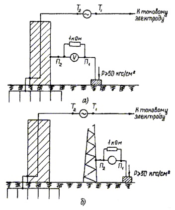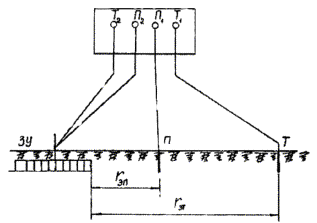 Пробный электрод погружается на глубину 0,5 м в грунт таким образом, чтобы не образовалось случайного контакта с заземлителем. Электрод сравнения устанавливается в предварительно очищенный (от травы, щебня и т.п.) и увлажненный грунт на расстоянии 0,5 - 1 м от пробного электрода. Между ними измеряется разность потенциалов jп,с, составляющая обычно 200 - 500 мВ, причем пробный электрод более отрицателен. Затем измеряется разность потенциалов между заземлителем ЗУ и электродом сравнения jз.