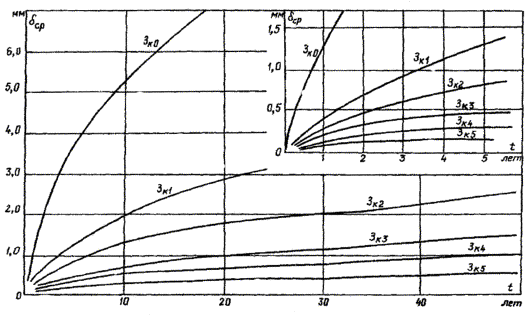 Значения Зк, равные 0; 1; 2, соответствуют большой опасности коррозии; значения Зк, равные 3 и 4, - средней степени опасности; равные 5 - слабой степени опасности. По кривым рис. П3.2, зная срок с момента сооружения подстанции, можно сделать прогноз коррозионного уменьшения сечения заземлителей и на основе этого выводы о состоянии заземлителя и сроках очередной проверки.