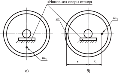 Остаточный статический дисбаланс проверяют установкой опорных шеек технологических осей (колеса или колесного центра) или буксовых шеек колесной пары на горизонтальные «ножевые» опоры балансировочного стенда. При самопроизвольной остановке колеса, колесного центра или колесной пары на «ножевых» опорах стенда радиус-вектор дисбаланса центра масс m1, направлен вниз (рисунок А.1, а).
