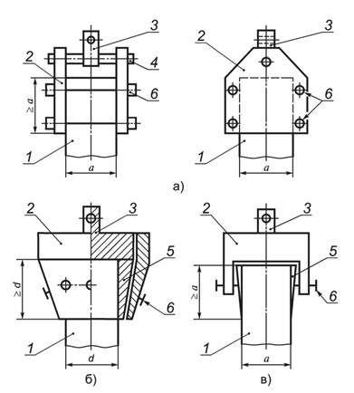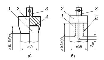 На рисунках К.1б), К.1в) приведены схемы гибкой конструкции сочленения элементов захвата для образцов квадратного и цилиндрического сечений соответственно, в которых самоцентрирование образца в процессе установки и испытания облегчается за счет гибкой тяги 4. В приведенной на рисунке К.1в) шарнирной конструкции захвата жесткая тяга 6 выполняет ту же функцию, что и гибкая. В случае применения захвата, схема которого приведена на рисунке К.1в), в галтельную часть образца при его изготовлении закладывают трубу для пропуска захвата.
