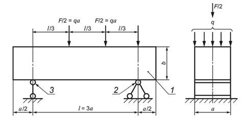Нагрузка от испытательной машины (установки) передается на образец через распределительную траверсу 7, выполненную в виде однопролетной балки. Длина траверсы должна быть не менее половины длины образца, а ее прогиб под нагрузкой - не более 1/500 ее пролета. Траверсу устанавливают на образец центрально относительно его осей и опирают на образец в двух сечениях в третях пролета. Шарнирно-неподвижная опора 8 траверсы выполнена так же, как и соответствующая опора образца. Шарнирно-подвижная опора 9 траверсы выполнена в виде цилиндрического катка, устанавливаемого между опорными пластинами, размеры которых должны соответствовать размерам опорных подушек.