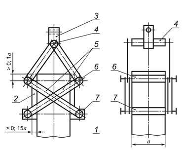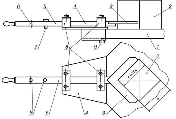В самозажимном захвате для образцов-призм (см рисунок К.4) каток 6 должен свободно перемещаться по прижимной пластине 2, а неподвижная опора захвата 7 должна быть жестко закреплена на ней. При установке захвата на образце для предотвращения его разрушения в захвате подвижная опора захвата (каток) 6 должна располагаться на расстоянии не менее чем 0,1а от торца образца.