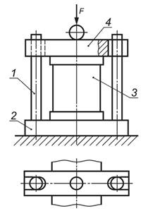1 - направляющие кондуктора; 2 - нижнее нагрузочное устройство; 3 - образец; 4 - верхнее нагрузочное устройство |