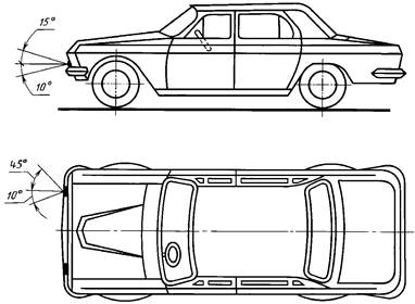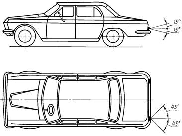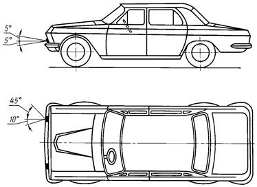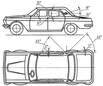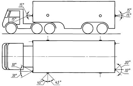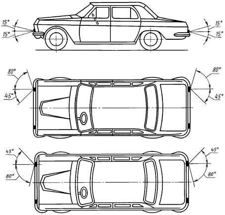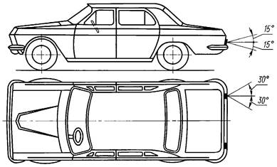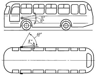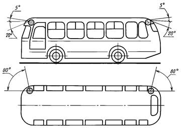 2.12.4. Фонари опознавательного знака должны быть видны в горизонтальной плоскости в пределах углов 80° влево и вправо относительно средней продольной вертикальной плоскости транспортного средства, а в вертикальной плоскости в пределах углов 5° вверх и 15° вниз относительно горизонтальной плоскости.