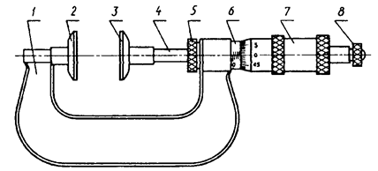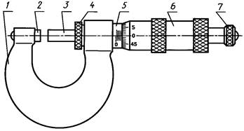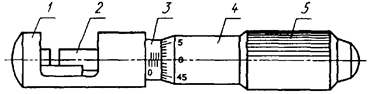 1 - корпус; 2 - микрометрический винт; 3 - стебель; 4 - барабан; 5 - трещотка (фрикцион)